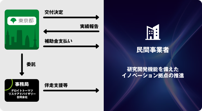 ディープテック・スタートアップのニーズを捉えたラボや実証フィールドなどの研究開発環境の整備に向け、既存の類似施設にはないような強力な支援機能を有するイノベーション拠点の形成に取り組む民間事業者を支援します。事業スキーム